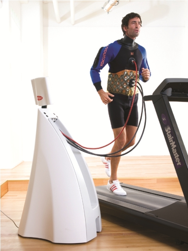 Kompressen- und Vakuumtherapie auf dem Laufband mit besonderer Vacunaut-Kleidung, die mit integrierten Druckzellen auf dem Abdomen sowie auf der Hüftregion arbeitet. Übt Druck und löst einen Vakuum Effekt während des Laufens auf dem Laufband aus.